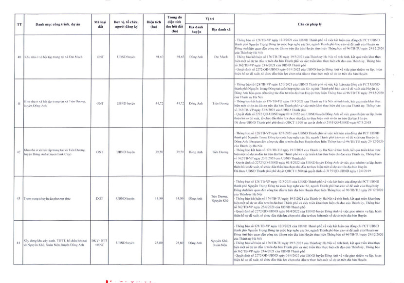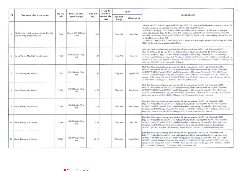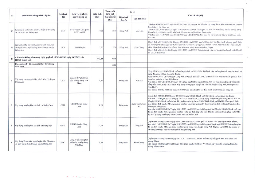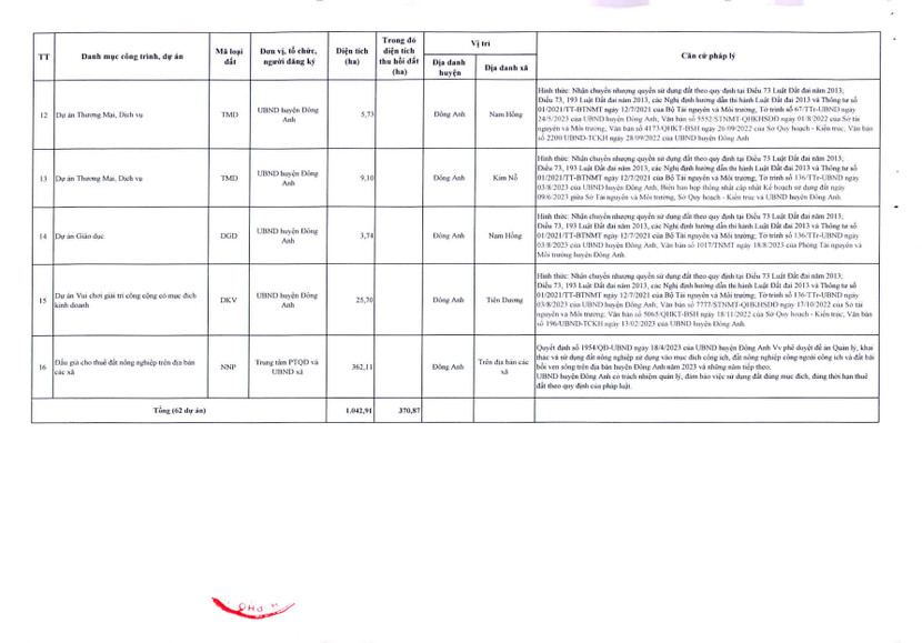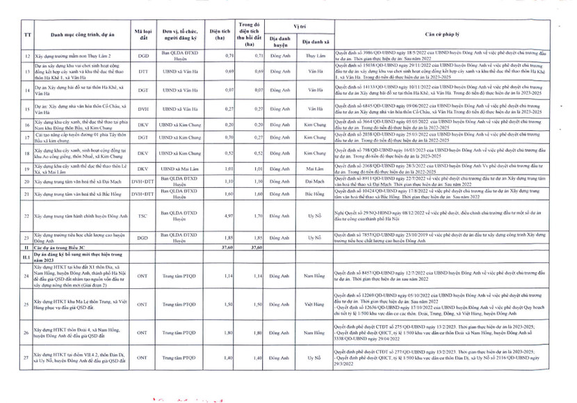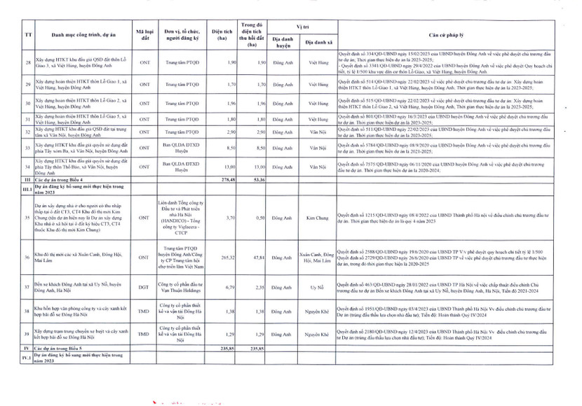 Chi tiết 62 dự án được bổ sung kế hoạch sử dụng đất năm 2023 của huyện Đông Anh như sau: