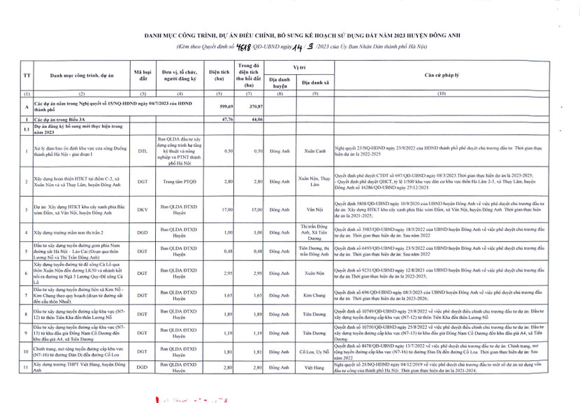 UBND TP Hà Nội mới có quyết định điều chỉnh, bổ sung danh mục Kế hoạch sử dụng đất năm 2023 và chỉ tiêu Kế hoạch sử dụng đất năm 2023 huyện Đông Anh đã được UBND TP phê duyệt tại Quyết định số 746/QĐ-UBND ngày 03/02/2023 và số 3155/QĐ- UBND ngày 08/6/2023 như sau: