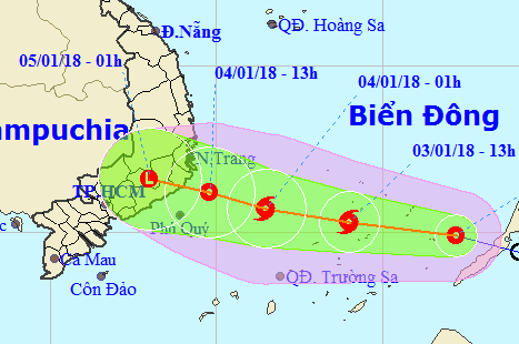 Dự báo trong 12 giờ tới, áp thấp nhiệt đới di chuyển nhanh theo hướng Tây Tây Bắc, mỗi giờ đi được 25-30km và có khả năng mạnh lên thành bão. Đến 13h ngày 03/01, vị trí tâm bão ở vào khoảng 10,3 độ Vĩ Bắc; 114,0 độ Kinh Đông, cách đảo Song Tử Tây (thuộc quần đảo Trường Sa) khoảng 140km về phía Nam. Sức gió mạnh nhất ở vùng gần tâm bão mạnh cấp 8 (60-75km/giờ), giật cấp 10.