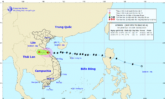 Trung tâm Dự báo khí tượng thủy văn quốc gia thông tin, trong đêm qua, bão số 4 tiếp tục di chuyển với tốc độ nhanh, sáng sớm nay, 30/8, bão số 4 đã đổ bộ đất liền từ Hà Tĩnh đến Quảng Bình và đã suy yếu thành áp thấp nhiệt đới.
