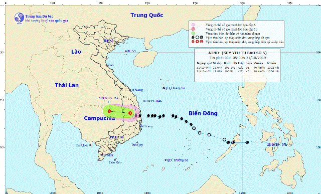 Đêm qua, bão số 5 đã đổ bộ vào Phú Yên- Bình Định, hiện đã suy yếu thành áp thấp nhiệt đới và di chuyển sang Campuchia