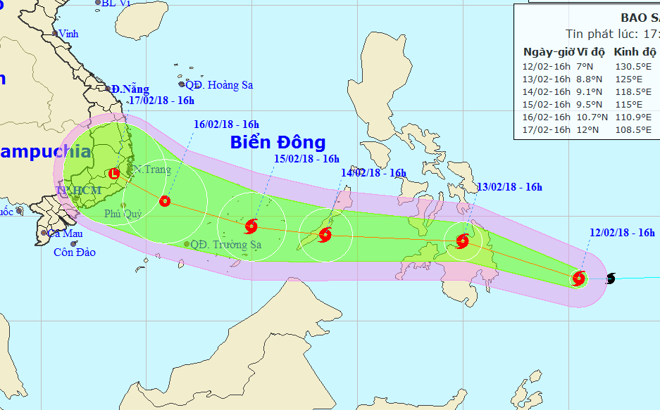Sau đó bão sẽ di chuyển chậm lại theo hướng Tây, đi vào Biển Đông nước ta. Đến 16h ngày 15/2 (30 Tết), vị trí tâm bão ở vào khoảng 9,5 độ Vĩ Bắc; 115,0 độ Kinh Đông, cách đảo Trường Sa (thuộc quần đảo Trường Sa) khoảng 340km về phía Đông Đông Bắc. Sức gió mạnh nhất ở vùng gần tâm bão mạnh cấp 8 (60-75km/giờ), giật cấp 11.