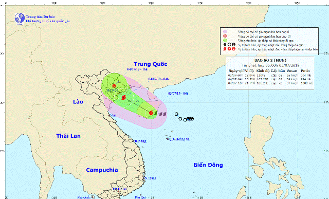 Trung tâm Dự báo khí tượng thủy văn quốc gia thông tin, vào tối qua, 2/7, áp thấp trên Biển Đông đã mạnh lên thành bão, có tên quốc tế là MUN, đồng thời trở thành cơn bão số 2 hoạt động trên Biển Đông trong năm 2019.