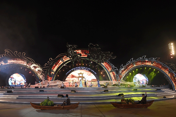 Trên đại cảnh sân khấu mô phỏng biểu tượng Vịnh Hạ Long với những hòn đảo nhấp nhô, nơi từng cặp rồng - phượng quấn quýt, hiệu ứng công nghệ video 3D mapping khiến không gian như mở ra vô tận, đưa khán giả trải nghiệm hành trình du lịch Việt từ Bắc chí Nam.