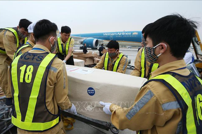 Nhân viên sân bay quốc tế Nội Bài vận chuyển thi thể các nạn nhân lên ô tô để đưa về quê nhà