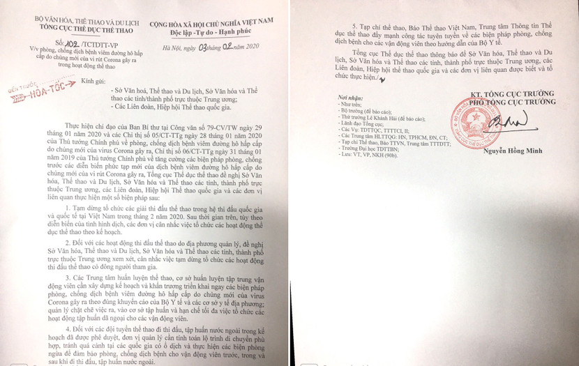 Công văn hỏa tốc của Tổng cục TDTT yêu cầu dừng tất cả các giải thể thao quốc gia và quốc tế trong tháng 2-2020