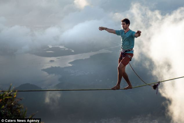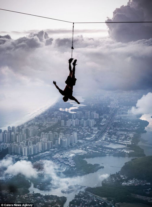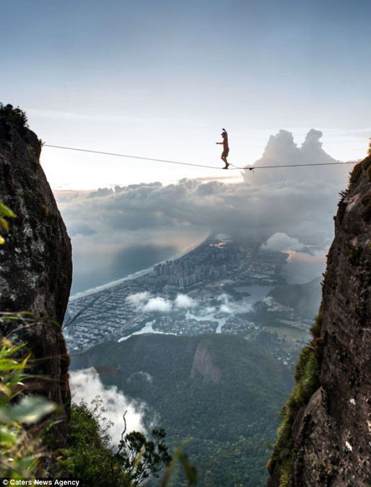 Bài báo cho biết, nam thanh niên can đảm này tên là Burian, buổi biểu diễn cực kỳ ấn tượng nhưng nguy hiểm này được anh tổ chức tại Thành phố Rio de Janeiro của Brazil. Trước tiên, anh Burian giữ cân bằng tư thế trên dây rồi từ từ ngồi xuống và ngả người ra trong tư thế nằm trên dây. Một lát sau anh từ từ nhỏm dậy lấy thăng bằng và đứng lên rồi đi tiếp, hoàn thành chặng đường đi trên dây của mình.