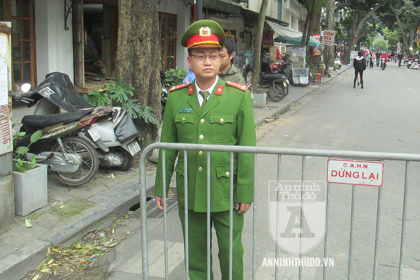 Đại úy Nguyễn Đình Tuấn (CSHS, CAP Hàng Mã) đang thực hiện nhiệm vụ tại phố đi bộ Hồ Gươm