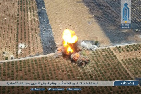 Hình ảnh trích trong video đăng tải ngày 15-8 ghi lại vụ nổ do đánh bom liều chết bằng SVBEID tại một thị trấn thuộc tỉnh Idlib, Syria