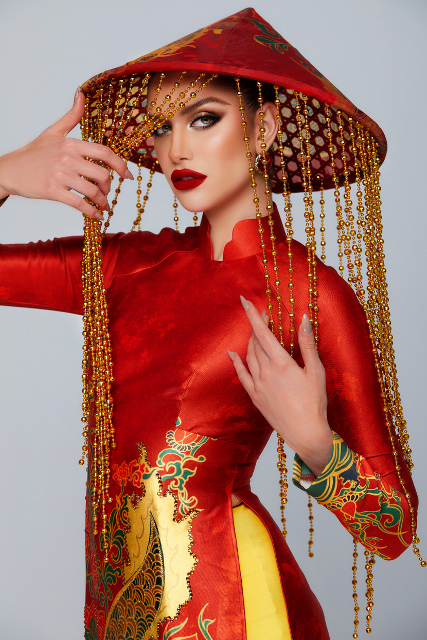 Phía ban tổ chức tiết lộ, từng bộ trang phục và phụ kiện trong bộ ảnh được êkíp chọn lựa kỹ lưỡng trước khi Isabella đến Việt Nam công tác vào hồi tháng 4-2023 vừa qua. Các thiết kế được thực hiện cầu kỳ, tỉ mỉ nhằm tôn lên đường nét hoàn hảo của nàng hậu, song bên cạnh đó cũng không thiếu đi những chi tiết tượng trưng cho nét đẹp trong văn hóa Việt. Đặc biệt, bộ trang phục áo dài mà cô mặc lần này là một mẫu sáng tạo của nhà thiết kế La Sen Vũ mang chất liệu lụa tơ tằm, gấm với những chi tiết được in, thêu tỉ mỉ.