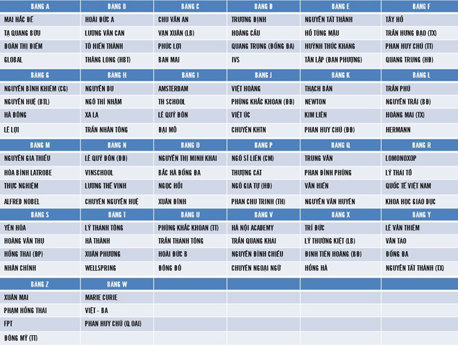 Cũng ở vòng bảng, bên cạnh những bảng đấu "tử thần" thì màn ra mắt của các tân binh như THPT Tạ Quang Bửu (bảng A), THPT Phúc Lợi, THPT Ban Mai (bảng C), THPT Việt Úc (bảng J), THPT Xuân Phương (bảng T), THPT Trần Quang Khải (bảng V)... hứa hẹn mang đến nhiều bất ngờ thú vị.