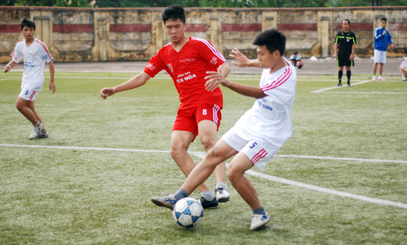 Cuộc đọ sức giữa THPT Hoàng Diệu (áo đỏ) và THPT Trí Đức diễn ra căng thẳng, quyết liệt