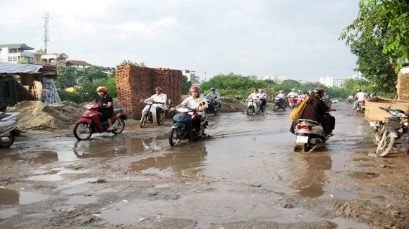 Đó là đoạn đường rẽ từ khu đô thị kiểu mẫu Linh Đàm vào khu Bằng A, phường Hoàng Liệt, quận Hoàng Mai lúc nào cũng trong tình trạng ngập nước và đầy những ổ gà to nhỏ trên mặt đường.