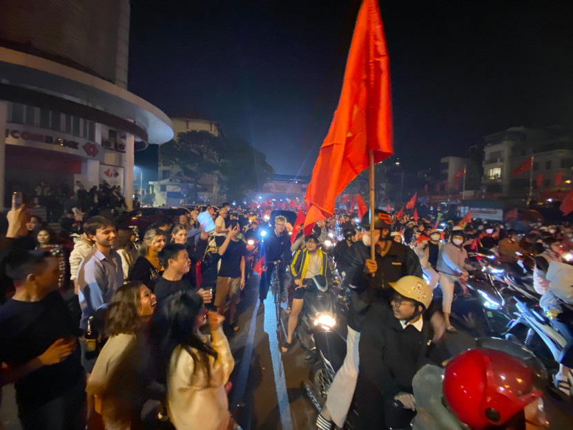 | Các du khách nước ngoài hoà vào dòng người hâm mộ chia sẻ chiến thắng của đội tuyển |
