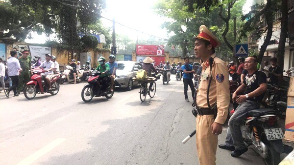 Có mặt tại khu vực cổng trường THCS Tô Hoàng, Trung tá Nguyễn Đức Huấn, Đội phó Đội CSGT số 4, Phòng CSGT cùng tổ công tác của đơn vị linh hoạt phân luồng đảm bảo ATGT phục vụ các thí sinh vào điểm thi. Toàn bộ hai chiều đường Đại Cồ Việt từ ngã tư Đại Cồ Việt – Phố Huế - Bạch Mai đều có CSGT làm nhiệm vụ. Phía ngã tư Giải Phóng – Đại Cồ Việt cũng có 1 tổ công tác hỗ trợ phân luồng từ xa.