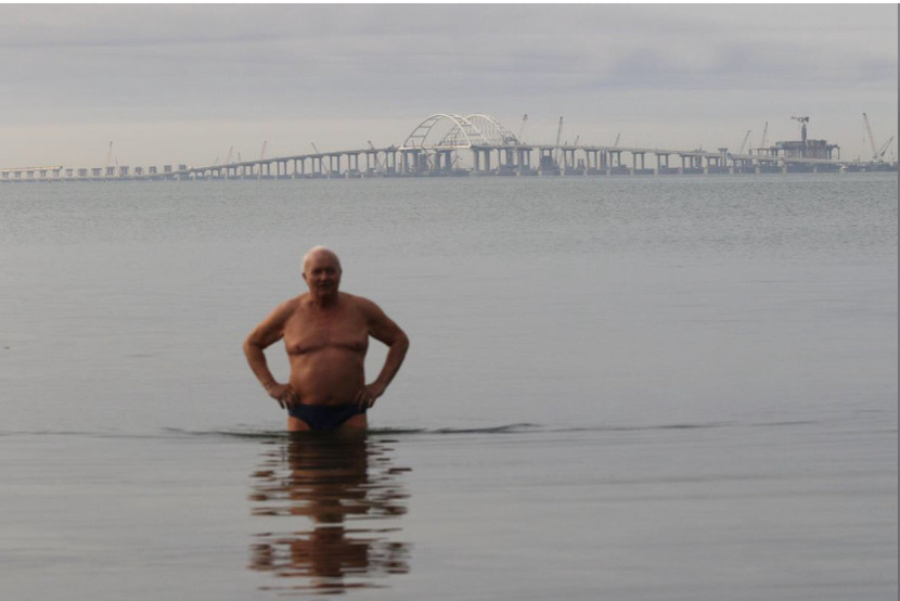 Một người đàn ông tắm tại eo biển Kerch, Crimea. Phía đằng sau là toàn cảnh cây cầu