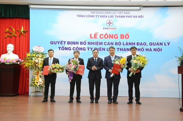Chủ tịch HĐTV EVN ông Dương Quang Thành (giữa) trao các quyết định bổ nhiệm cán bộ cho lãnh đạo EVNHANOI