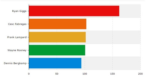 Chỉ có một người sở hữu thành tích tốt hơn Fabregas là cựu cầu thủ của M.U, Ryan Giggs, người giải nghệ vào năm 2014.