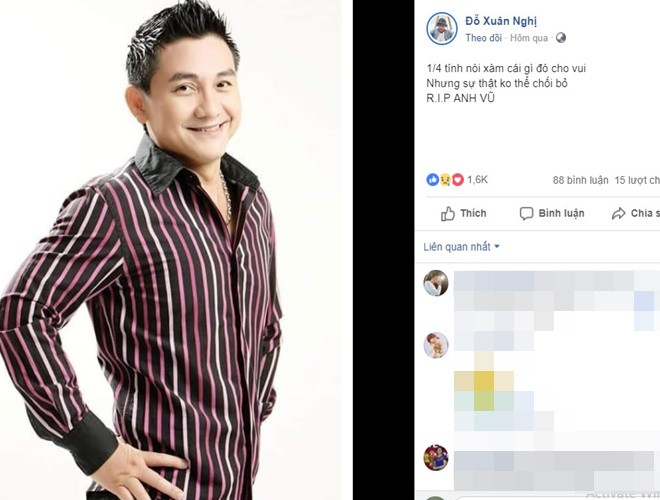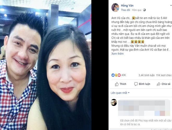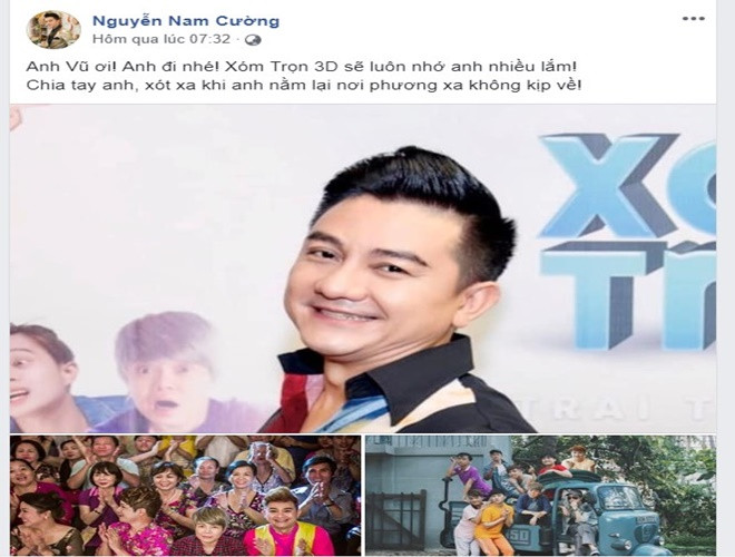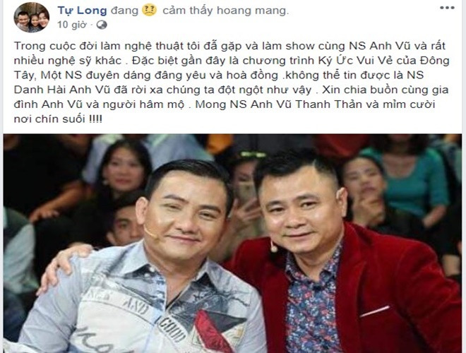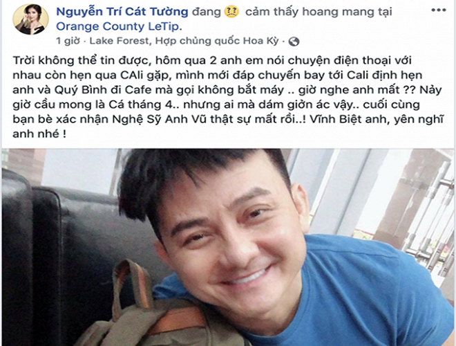 ANTD.VN - Trước tin nghệ sĩ hài Anh Vũ đột ngột qua đời trong chuyến lưu diễn tại bang Califonia, Mỹ, nhiều nghệ sĩ Việt không giấu nổi sự bàng hoàng đau xót, tiếc thương cho một người đồng nghiệp hiền lành, giản dị, sống chân chất. Nhiều sao Việt đã đăng những dòng trạng thái đau buồn lên Facebook, sẻ chia với nỗi đau và sự ra đi vội vàng của nghệ sĩ Anh Vũ.