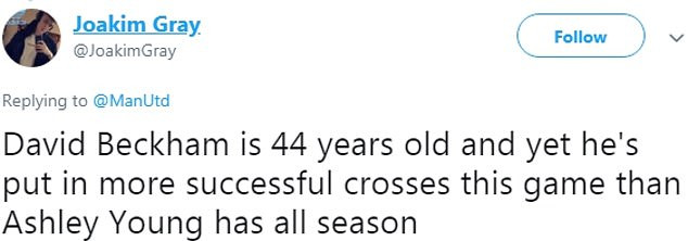 Tài khoản Joakim Gray thì so sánh: "Beckham đã 44 tuổi và số lần anh ấy tạt bóng thành công ở trận này còn nhiều hơn tổng số cú tạt của Ashley Young từ trước đến nay".