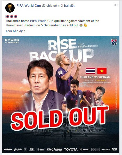 Trang facebook của FIFA mới đây đã đưa thông tin về trận "siêu kinh điển Đông Nam Á" giữa Thái Lan và Việt Nam ngày 5-9 tới, trong đó bày tỏ ấn tượng với việc hàng vạn chiếc vé của trận đấu được bán hết chỉ sau ít phút mở bán.