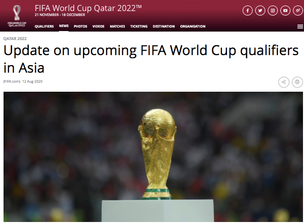 Ngày 12-8, trang chủ FIFA chính thức thông báo hoãn các trận đấu vòng loại World Cup 2022 khu vực châu Á.