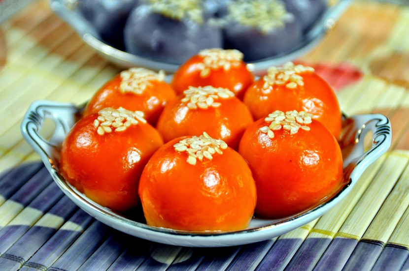 Mở rộng danh sách ẩm thực từ gấc thì có thêm bánh chưng gấc. Trong đó, gấc cũng được trộn với gạo nếp y như để nấu xôi, sau đó đổ ra để gói bánh. Dưới cùng là lớp gạo, gấc, trên là đậu xanh, thịt ba chỉ, hạt tiêu... đổ thêm một lớp gạo bên trên rồi gói lại bằng lá dong. Cũng cứ luộc dền hơn 10 tiếng trên bếp là có thành phẩm bánh chưng gấc thơm, ngon, lạ miệng mà màu lại đẹp nữa. Sau bánh chưng còn có bánh gai gấc. Gấc được trộn với bột nếp làm vỏ bánh, nhân bánh thì có đậu xanh, mứt bí, hạt sen, dừa sợi, vừng, đường, lá chuối khô... bánh sau khi gói được hấp chín. Bánh gai gấc cho một hương vị rất đặc biệt so với loại bánh gai truyền thống màu đen. Không chỉ có thế, gấc còn được sáng tạo làm thành bánh trôi gấc. Đĩa bánh trôi đỏ au, rất phù hợp cho việc bày biện và thắp hương.
