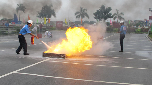... nhanh chóng bứt phá, dùng bình bột dập lửa trong khay xăng