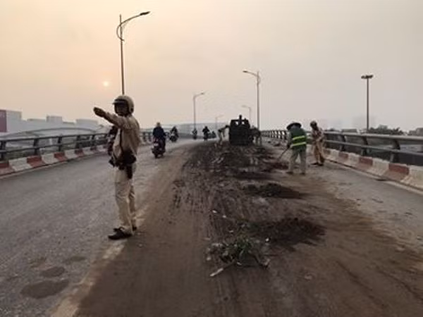 Lực lượng CSGT phân luồng, hỗ trợ cùng với công nhân vệ sinh môi trường thu dọn phế thải đất cát lái xe đánh rơi trên đường, nhằm phòng ngừa ùn tắc và TNGT
