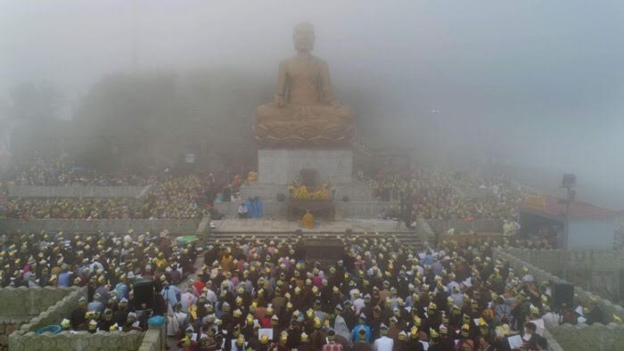 Các phật tử tụng kinh Dược Sư dưới tượng Phật Hoàng
