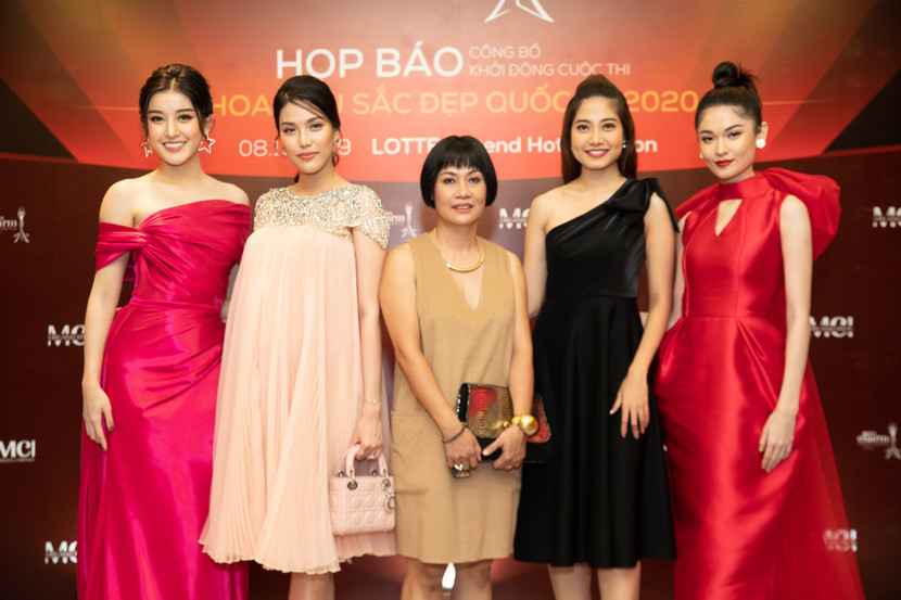 Bà Nguyễn Thị Thúy Nga (giữa) cùng các người đẹp tại sự kiện họp báo công bố cuộc thi