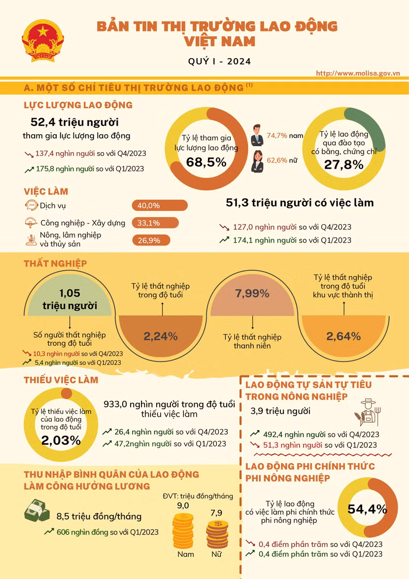 Trong quý I/2024, số lao động có việc làm đạt 51,3 triệu người, tăng 174.100 người so với cùng kỳ năm trước. Thu nhập bình quân của người lao động làm công hưởng lương tiếp tục được cải thiện, đạt mức 8,5 triệu đồng/tháng, tăng 606.000 đồng so với cùng kỳ năm trước.