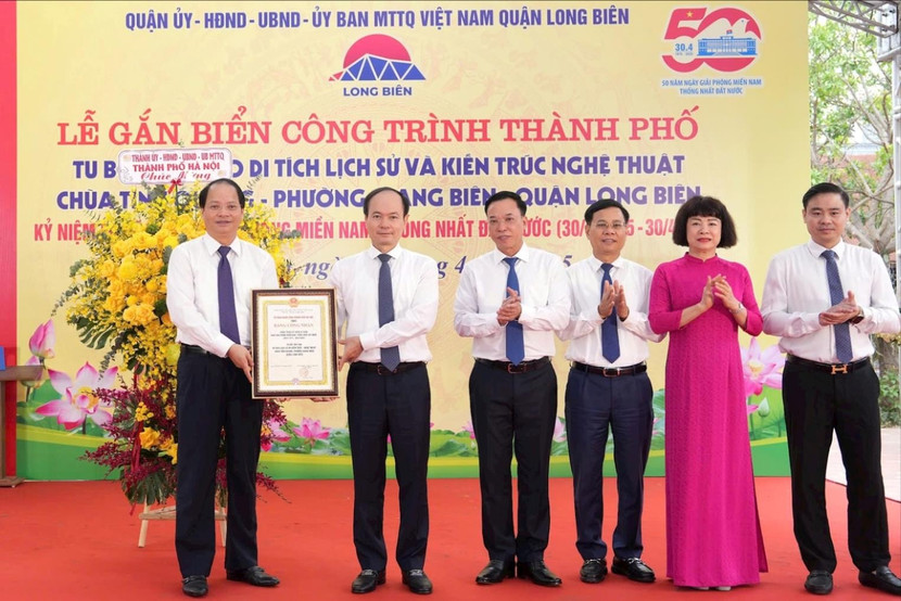 Trưởng ban Tuyên giáo và Dân vận Thành ủy Nguyễn Doãn Toản, lãnh đạo quận Long Biên thực hiện nghi thức gắn biển công trình chào mừng kỷ niệm 50 năm Ngày Giải phóng miền Nam, thống nhất đất nước