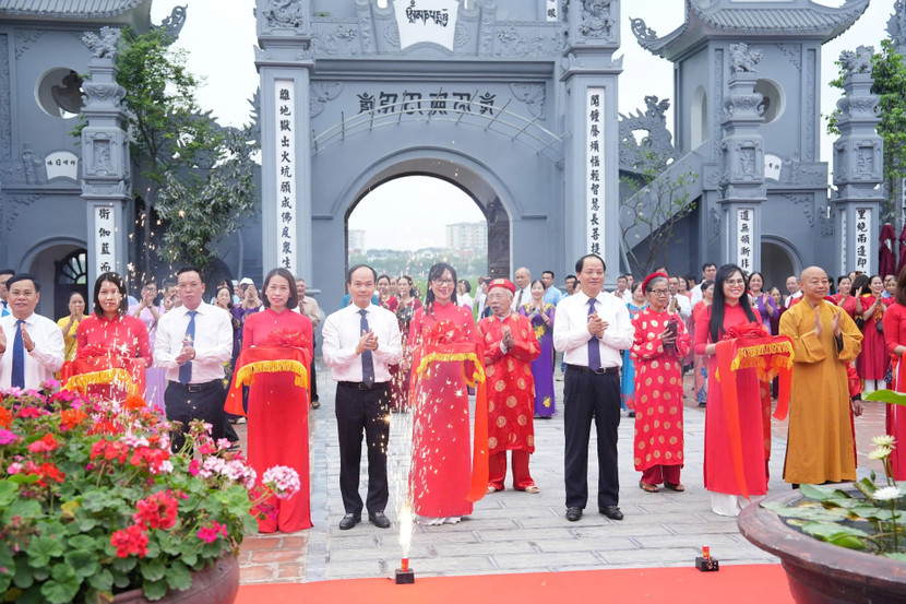 Các đại biểu cắt băng khánh thành công trình tu bổ, cải tạo di tích lịch sử và kiến trúc nghệ thuật chùa Tình Quang