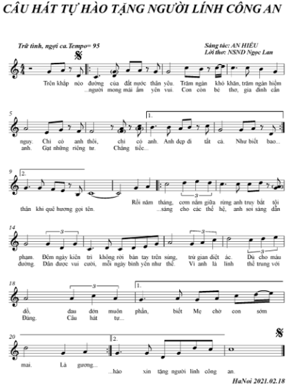 - Viết về hình tượng người chiến sĩ CAND, có bài của An Hiếu thì sôi nổi, bài thì trầm lắng, có bài lại trẻ trung đời thường. Anh bắt gặp ý thơ của NSND, diễn viên điện ảnh Ngọc Lan như thế nào để sáng tác ca khúc về người chiến sĩ CAND với âm hưởng Bolero nhẹ nhàng nhưng vẫn đậm chất lính?