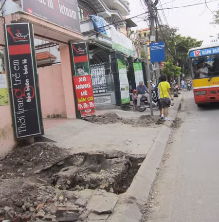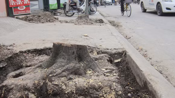 Có mặt tại khu vực trên chiều 23-8, chúng tôi thấy toàn bộ phần thân và lá của 2 cây muồng này được dọn sạch, chỉ còn trơ trụi 2 gốc cây đang đào dở với đường kính rộng khoảng 20-30cm. Đoạn vỉa hè quanh khu vực 2 gốc cây này đã bị xới tung, đất đá ngổn ngang song không có bất cứ cá nhân, đơn vị nào đứng ra thu dọn. Do vậy, một số người đi bộ khi đi đến đoạn đường này buộc phải vòng xuống lòng đường. Điều này vô cùng nguy hiểm bởi ngay sát gốc cây thứ nhất đã bị chặt là một điểm dừng đỗ đón trả khách của xe buýt.