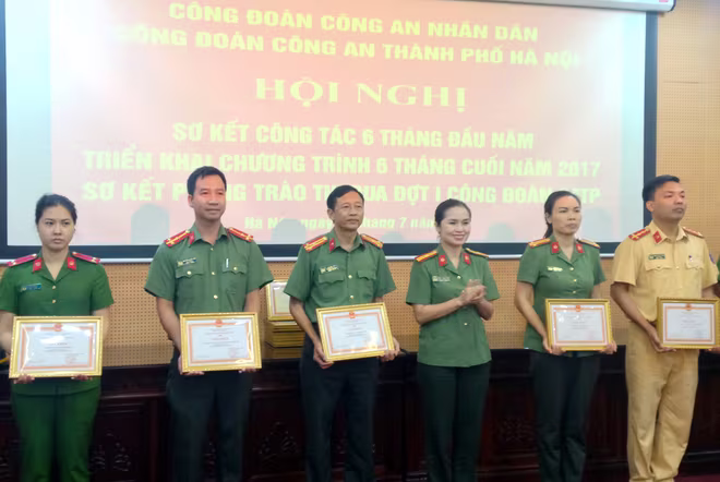 Thiếu tá Công Thanh Thảo - Phó Chủ tịch Công đoàn CAND, trao tặng Giấy khen cho đại diện tập thể các công đoàn cơ sở đạt thành tích xuất sắc trong 6 tháng đầu năm 2017