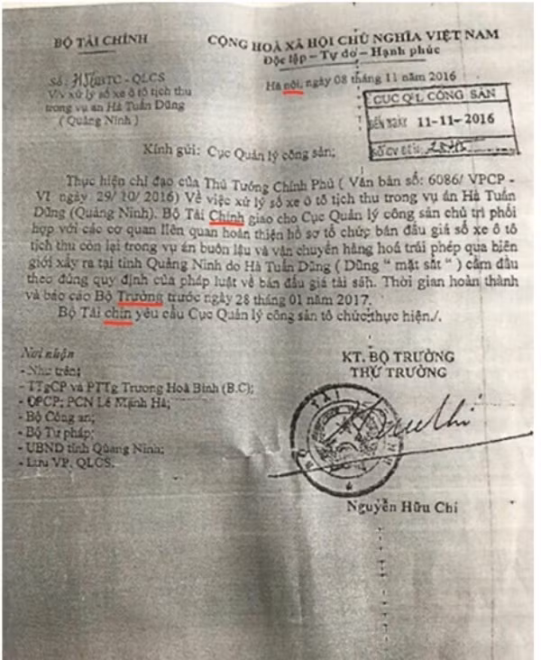 Tại văn bản giả mạo Bộ Tài chính ghi số 3156 ngày 8/11/2016 có nội dung: “Kính gửi Cục quản lý Công sản. Thực hiện chỉ đạo của Thủ tướng Chính phủ (Văn bản số 6068/VPCP-VI ngày 29/10/2016) Về việc xử lý số xe ô tô tịch thu trong vụ án Hà Tuấn Dũng (Quảng Ninh).