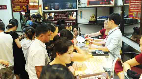 Giá vàng tăng mạnh khiến thị trường giao dịch sáng nay khá sôi động. Tại các cửa hàng của BTMC, lượng khách đến giao dịch tương đối tấp nập. Do giá vàng tăng mạnh, nhiều nhà đầu tư và người dân “lướt sóng” bán kiếm lời nên lượng khách bán nhiều hơn lượng khách mua (khoảng 65% lượng khách bán và 35% lượng khách mua).