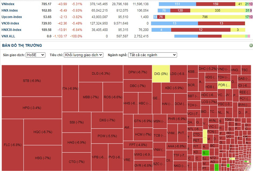 Trái ngược hoàn toàn với thị trường vàng là diễn biến ảm đạm của thị trường chứng khoán. Trong phiên giao dịch 27/7, chỉ số VN-Index giảm mạnh 43,99 điểm (5,31%) và đóng cửa tại 785,17 điểm, đây cũng là mức thấp nhất của VN-Index kể từ đầu tháng 5 tới nay.
