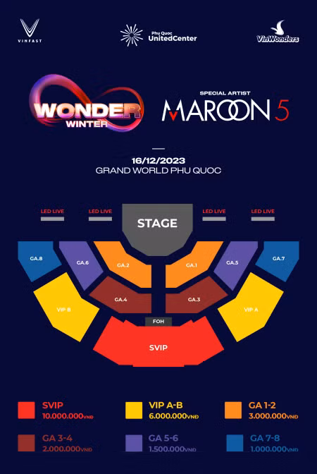 Ngay sau đó, ban tổ chức 8Wonder Winter Festival tiếp tục “làm nóng” toàn cõi mạng khi chính thức công bố giá vé và sơ đồ chỗ ngồi trên website của chương trình trước thời điểm mở bán sớm. Toạ lạc tại Quảng trường biển thơ mộng của “thành phố không ngủ Grand World”, khán đài của siêu đại nhạc hội được thiết kế khoa học và hợp lý, bố trí thành 6 khu vực chính tương ứng với 6 loại vé thuộc 2 hạng phổ thông và VIP, có giá từ 1 đến 10 triệu đồng.