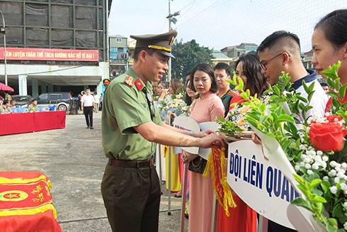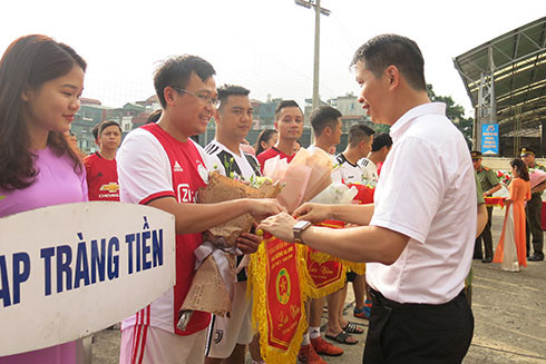 Ban Chỉ huy CAQ Hoàn Kiếm và đại diện UBND quận Hoàn Kiếm tặng hoa, cờ lưu niệm cho 25 đội tuyển thi đấu
