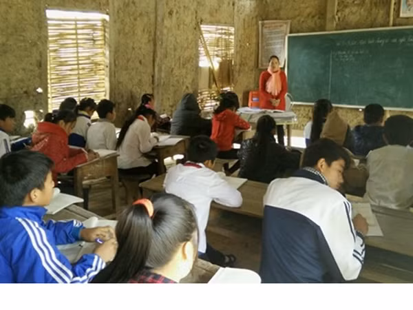 Nhiều học sinh ở Trường THCS Chiềng Sơ, Sơn La hiện vẫn đang phải học trong các phòng học tạm bằng nhà tranh vách đất.