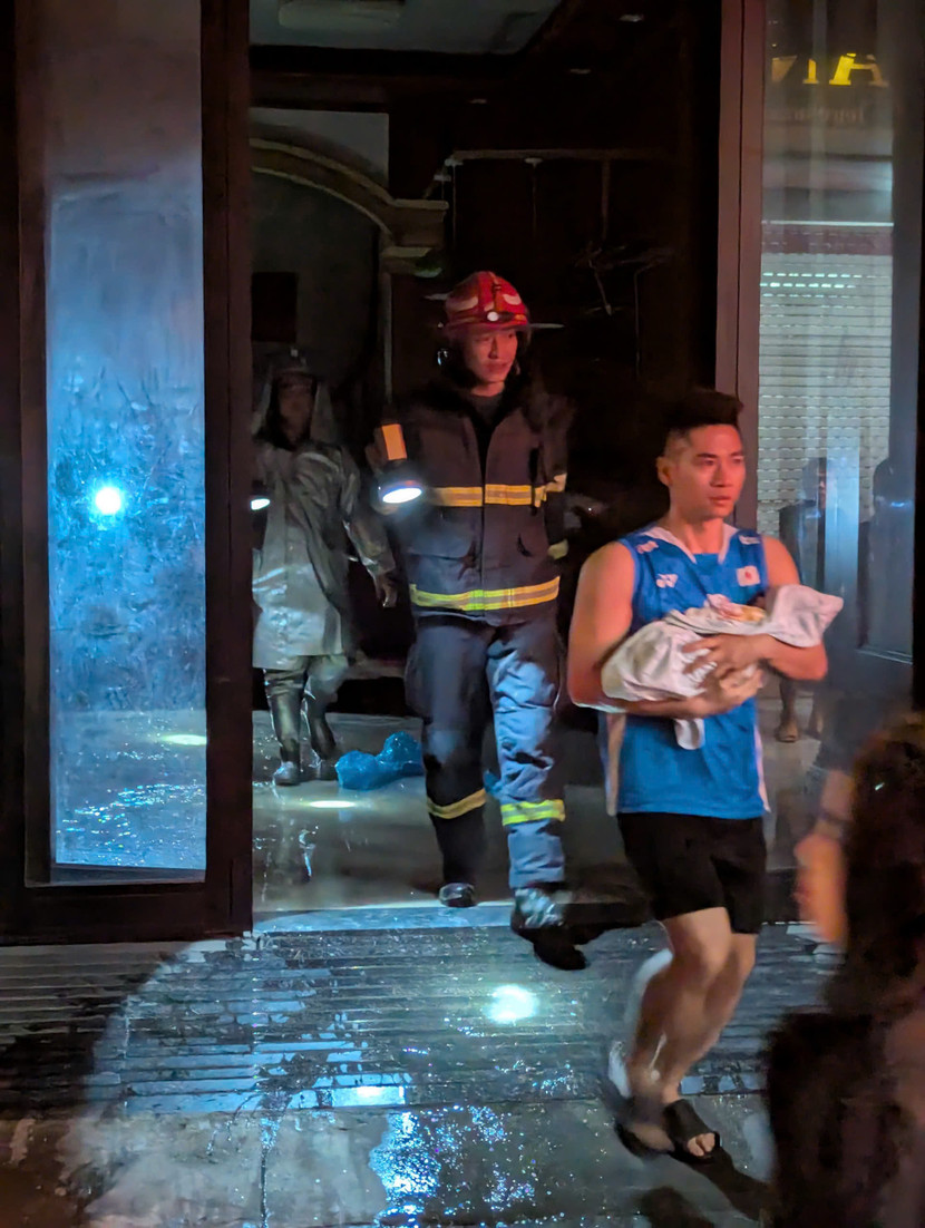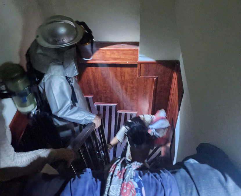 Người trong nhà được các chiến sỹ chữa cháy, cứu nạn đưa xuống qua cầu thang bộ