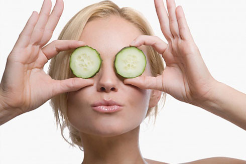 Đắp dưa chuột. Nằm xuống, nhắm mắt lại, lấy lát dưa chuột đắp lên cả 2 mắt và giữ chúng khoảng 10 phút. Dưa chuột không chỉ giúp mắt thư giãn, nó cũng tránh khô mắt.