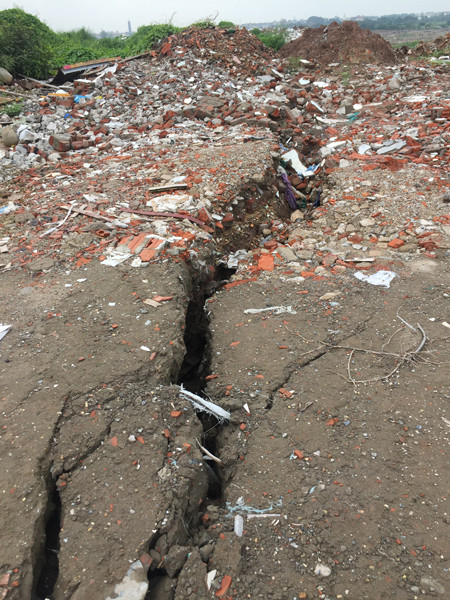 Những vết nứt toang hoác báo hiệu sạt lở xuất hiện khắp nơi trên đỉnh núi đất thải