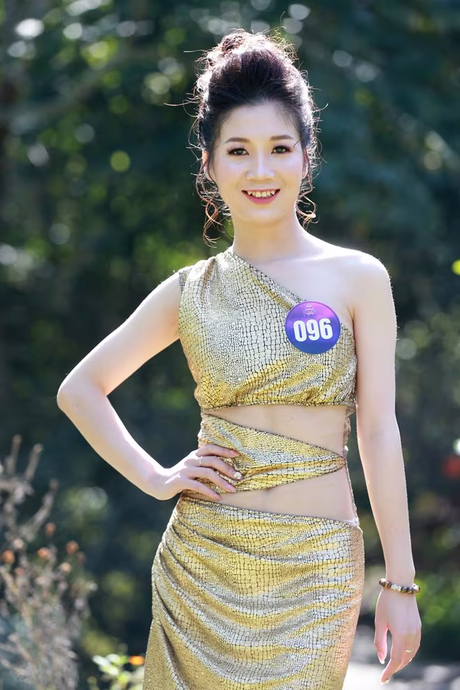 “Điểm nhấn đặc biệt của bộ trang phục chính là đường cắt xẻ ở phần eo, ngoài ra đường may lệch vai cũng là một trong những điểm nhấn thú vị được kết hợp gam màu màu vàng chất liệu ánh kim tạo vẻ phóng khoáng, hiện đại, thể hiện sự trẻ trung, vui tươi." - nhà thiết kế Hoàng Thanh Tú chia sẻ.