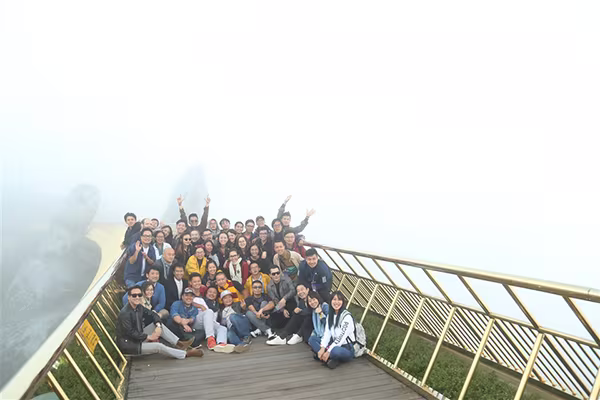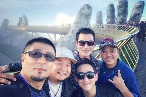 Diễn viên- ca sĩ Hứa Vĩ Văn cùng các đồng nghiệp phấn khích hội ngộ tại Bà Nà Hills. Tất nhiên, họ cũng không bỏ qua những bức hình với “cây cầu thần thánh”.