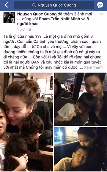 Trên trang cá nhân cách đây vài tiếng, Cường Đôla bất ngờ đăng tải những hình ảnh rất ấm áp của vợ cũ và con trai Subeo kèm theo những dòng chia sẻ đầy tình cảm. Anh viết "Ta là gì của nhau??? Là một gia đình nhỏ gồm 3 người. Con cần cả tình yêu thương, chăm sóc , quan tâm, dạy dỗ... từ cả cha và mẹ... Vì vậy với con đương nhiên chúng ta là một gia đình dù có gì xảy ra đi chăng nữa".