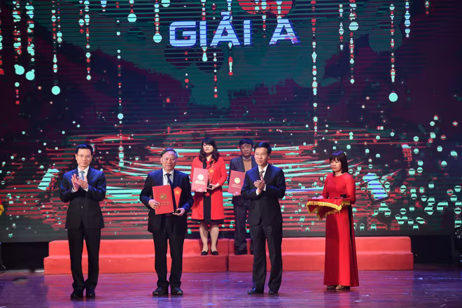 Trưởng Ban Tuyên giáo Trung ương Võ Văn Thưởng và Bộ trưởng Bộ Thông tin và Truyền thông Nguyễn Mạnh Hùng trao giải A cho đội ngũ các tác giả